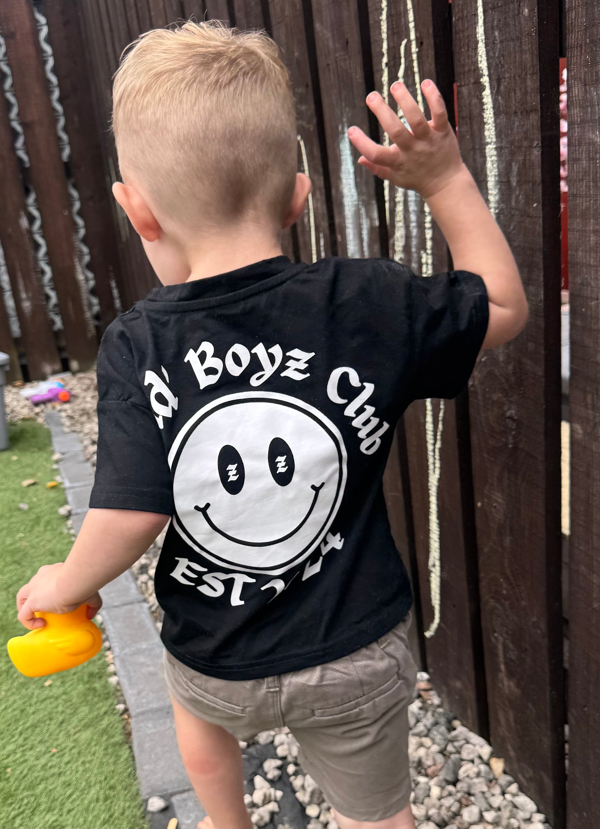 - This black short sleeve t-shirt features a large black graphic with a playful twist- a bold white smiley face with sleepy Z eyes.